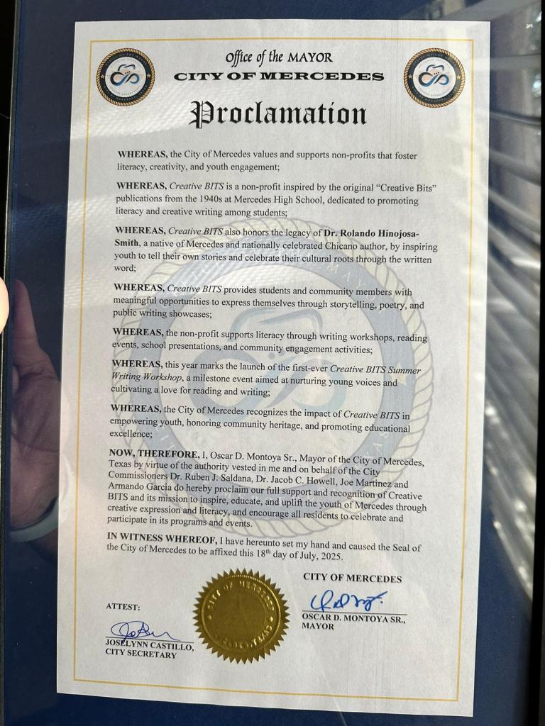 Our writing workshop is a collaboration between the Mercedes Public Library, The City of Mercedes, and our organization. We bring in local authors and work with the library to host a summer workshop that encourages creative potential. Our programming seeks to help youth build confidence, express complex thoughts, and gain new skills through in-person feedback. We are currently the only organization coordinating creative writing workshops in Mercedes, Texas. This program was recognized by the City of Mercedes in July of 2025 for its advocacy of reading and writing.